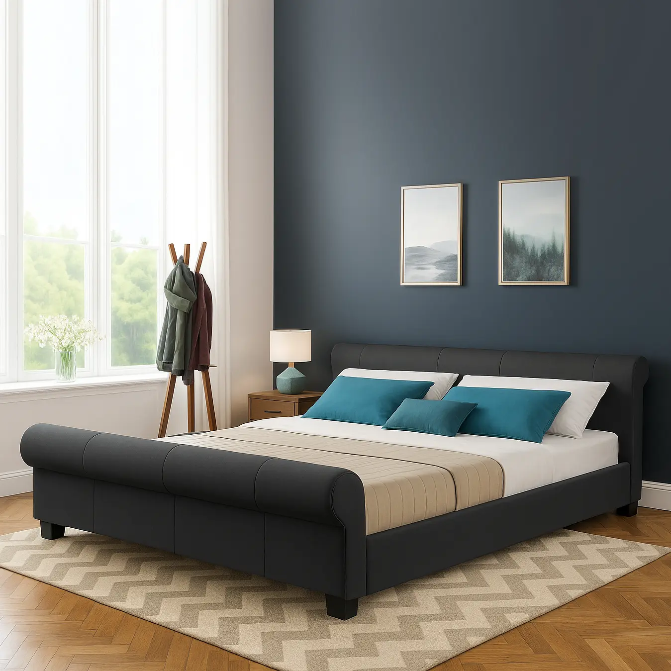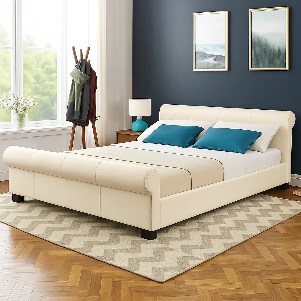 At Asghar Furniture, Add a touch of elegance to your bedroom with the Crum platform bed. This close-to-the-floor bed frame will make your bedroom look refined. Covered in soft, lush leatherette and crafted with a solid wood frame, this luxurious sleigh bed will last for years.