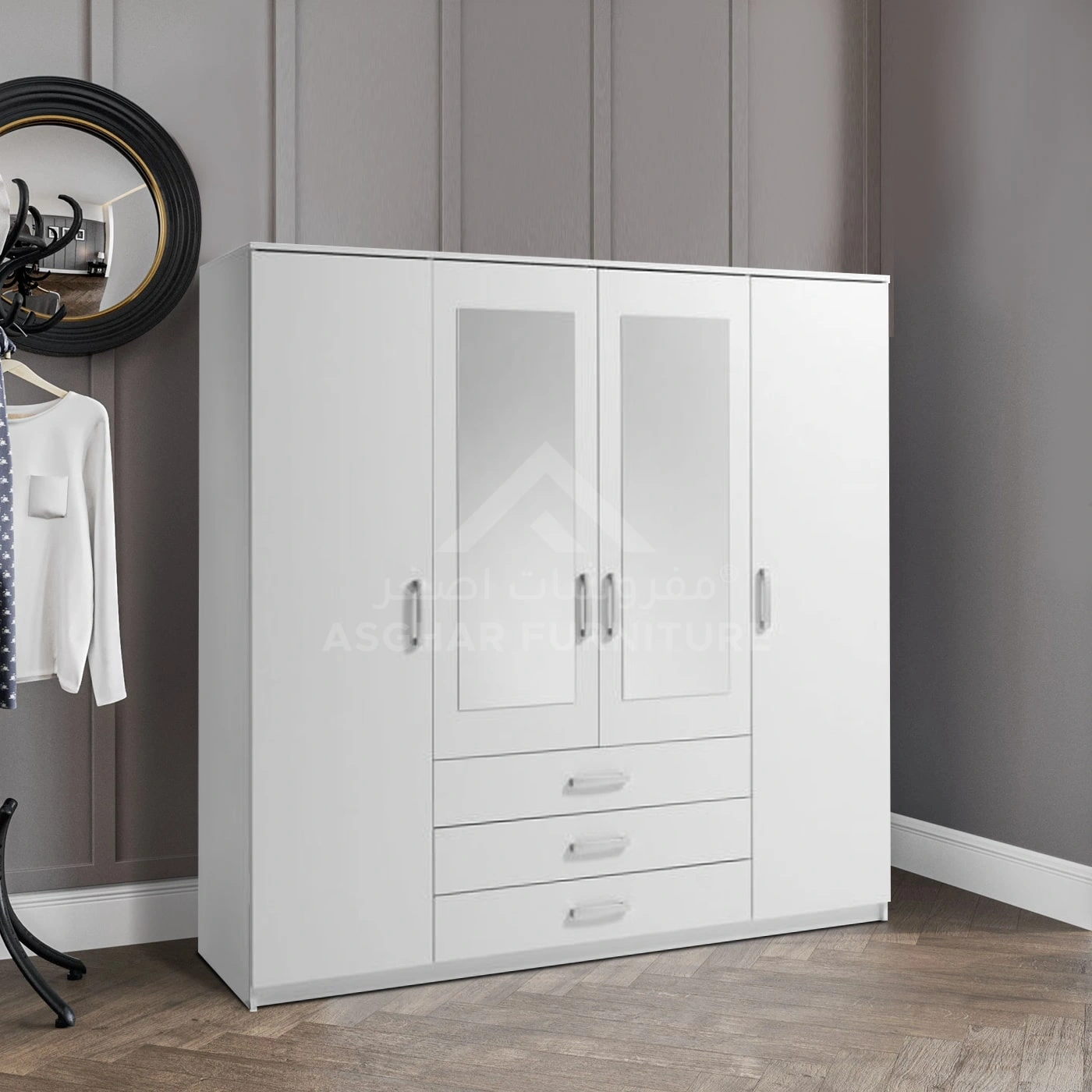 Say goodbye to everything that clutters your bedroom with the Dulab Mirror Wardrobe, ingeniously crafted by Asghar Furniture. This white wardrobe offers ample hanging space for clothes, multiple shelves, and three large, silky-sliding drawers designed to keep your room neat and organized. Specifications