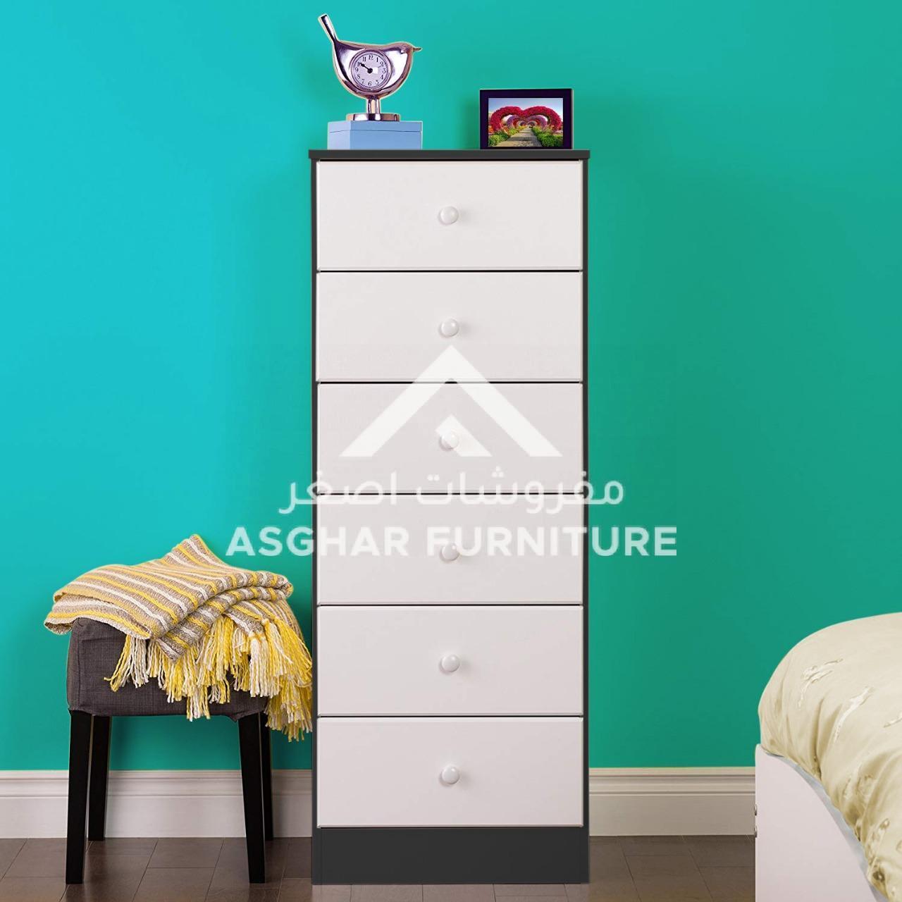 Add a functional focal point to any room with this contemporary Tall 6-Drawer Chest by Asghar Furniture. Featuring six drawers with genuine metal pulls, this contemporary chest offers extra space for storing.