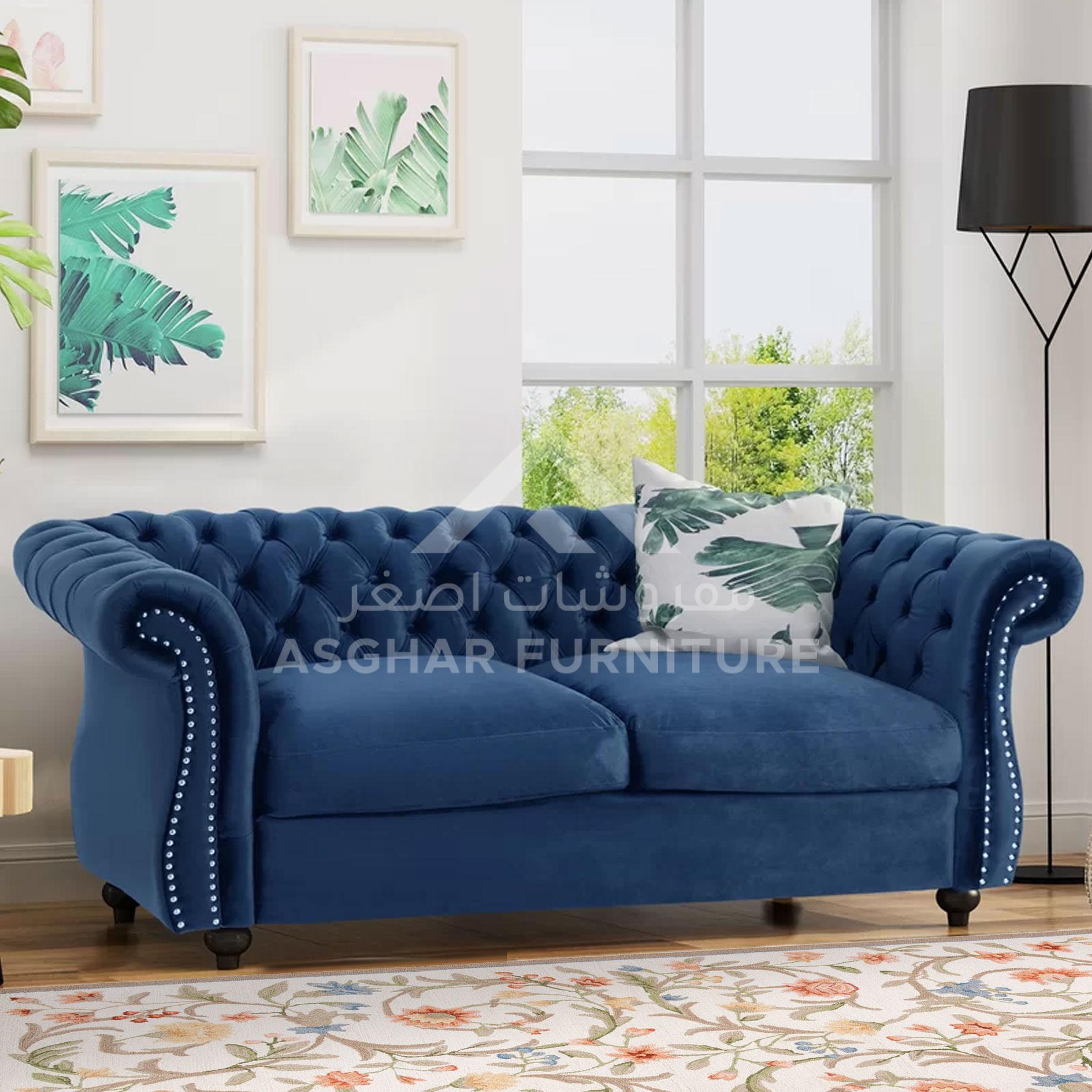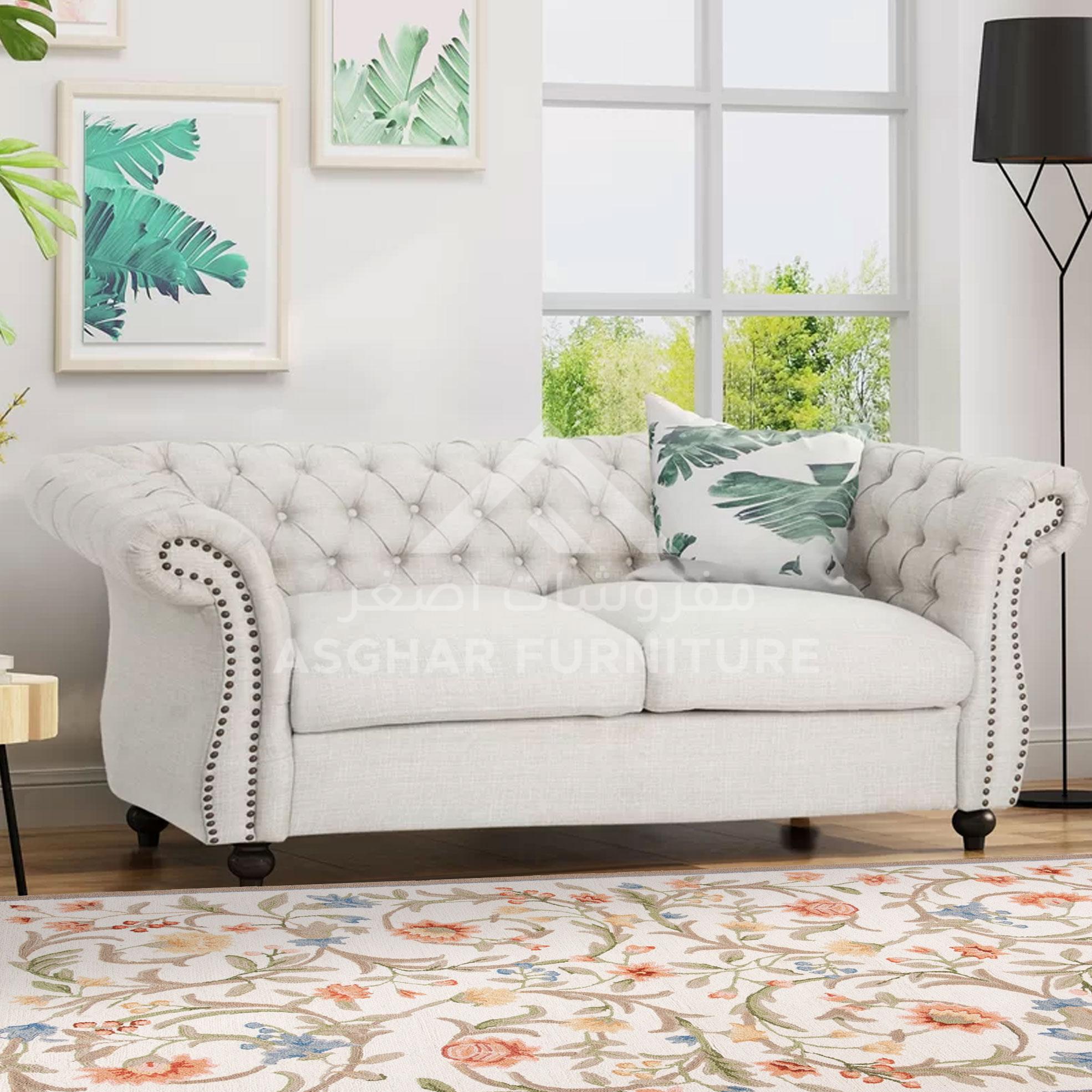 At Asghar Furniture, This Harley Flared Arm Loveseat, has a frame constructed of solid and manufactured wood, upholstered with 100% polyester, and filled with foam. It features flared arms, a tufted back, and nailhead trim.