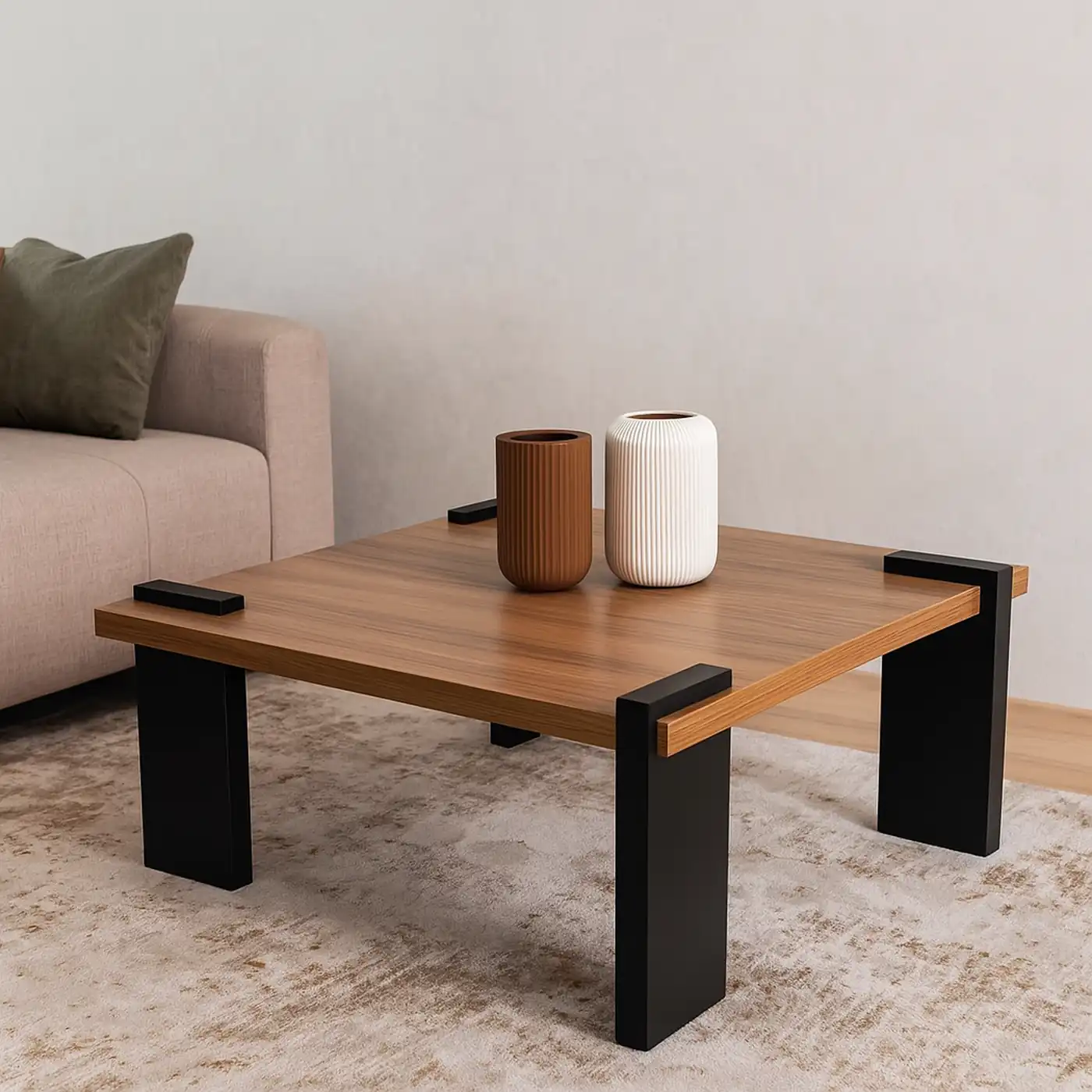 This Coffee Table features a low-profile square design with a solid wood top framed by matte black metal legs that wrap over the corners — a striking interplay of material and form. Designed for modern spaces that value both functionality and visual harmony, it’s perfect for grounding a living room with effortless style. Pair it with warm-toned décor or monochrome accents to elevate your setting.